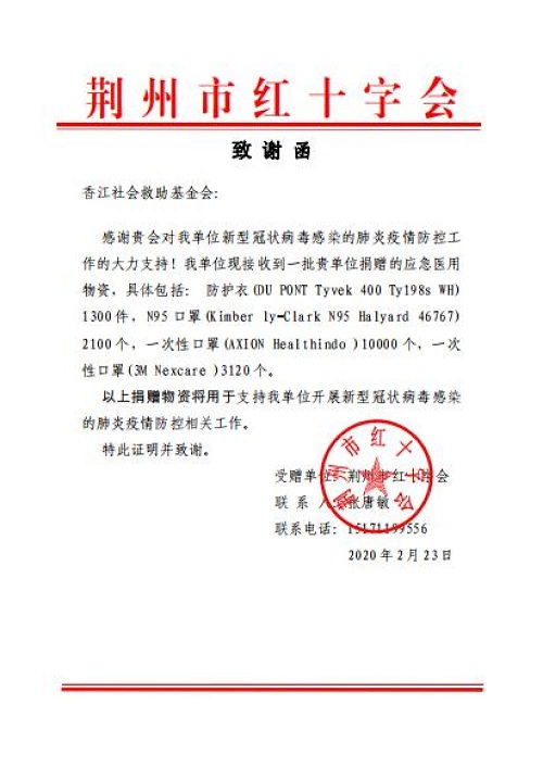 為確保合理安排,提高醫(yī)療物資調(diào)配使用率,我會委托荊州市工商聯(lián)、荊州市紅十字會定向捐贈給下屬荊州市的11所醫(yī)療單位,包括:荊州市第一人民醫(yī)院、荊州市第二人民醫(yī)院、荊州市第三人民醫(yī)院、荊州市第五人民醫(yī)院、荊州市胸科醫(yī)院、荊州市中醫(yī)院、荊州市疾控中心、荊州市公安縣人民醫(yī)院、洪湖市人民醫(yī)院(洪湖市防疫指揮部)、石首市中醫(yī)院、監(jiān)利縣人民醫(yī)院。